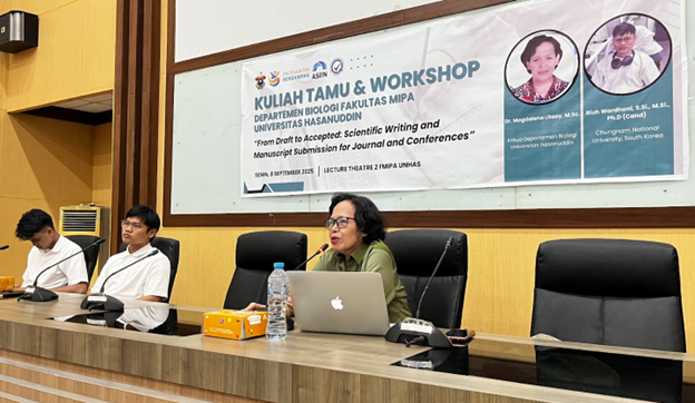 The event was officially opened by the Head of the Biology Department, Dr. Magdalena Litaay, M.Sc. In her remarks, she expressed her appreciation for the guest lecture and urged all participants to make the most of the opportunity. She also emphasized that the guest lecture and scientific publication writing workshop are important platforms for students and lecturers to improve their academic capacity, particularly in writing high-quality scientific papers.