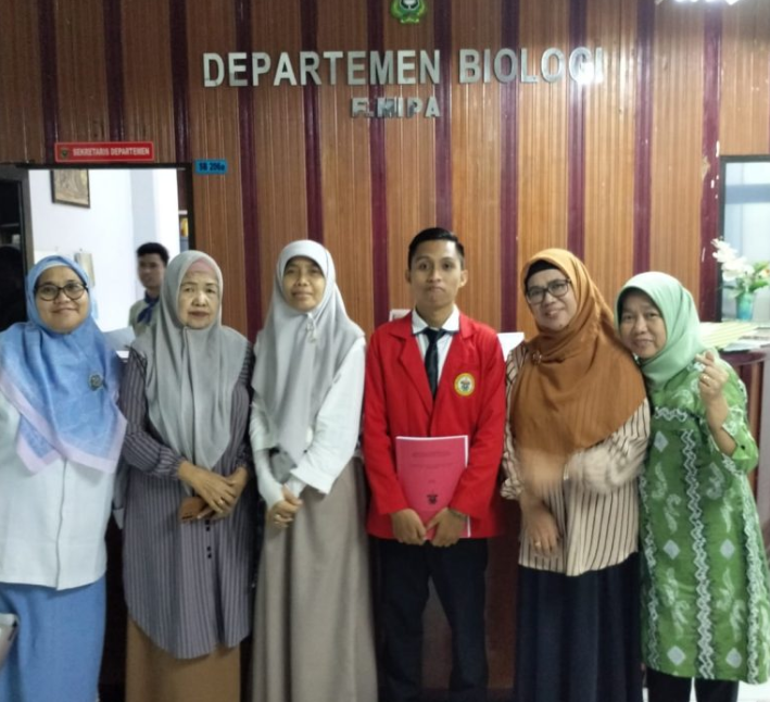 Nurman's final examination was attended by Dr. Ambeng, M.Si. and Dr. Syahribulan, M.Si. as his supervisors, and Dr. Zohra Hasyim, M.Si.; Dr. Zaraswati Dwyana, M.Si.; and Dr. A. Masniawati, M.Si. as examiners. Also present were the Head of the Master of Biology Program, Dr. Juhriah, M.Si.; and the Head of the Biology Department, FMIPA UNHAS, Dr. Magdalena Litaay, M.Sc.