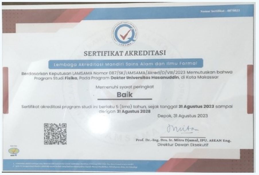 The Doctoral Study Program in Physics obtained a GOOD accreditation based on LAMSAMA Decree No. 087/SK/LAMSAMA/Akred/D/VIII/2023.