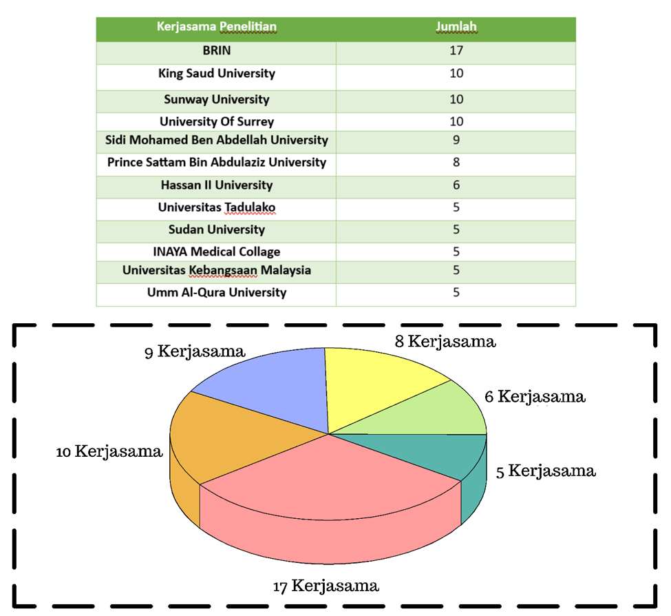 International cooperation in recent years includes 69 (Sixty-Nine) research collaborations, both domestic and foreign, such as with Chungbuk University (Korea), King Saud University, Sunway University, University of Surrey, Sidi Mohammed Ben Abdellah University, Prince Sattam Bin AbdulAziz University, Hassan II University, Sudan University, INAYA Medical Collage, Universitas Kebangsaan Malaysia, Umm Al-Qura University, Bharathidasan University, University of Bahrain, Princess Nourah bint Abdulrahman University, Najran University, Khairun University, University Putra Malaysia, Korea Advanced Institute of Science and Technology (KAIST), The University of Melbourne, San Diego State University, Ehime University, Kahramanmaras Istiklal University, Isra University, Multimedia University, Sebha University, The National University of Malaysia, King Fahd University, Universitas Brawijaya, Universitas Samratulangi, Universitas Tadulako, Universitas Medan, Universitas Riau, Universitas Atmajaya, Universitas Muslim Indonesia, Universitas Airlangga, Universitas Gadjah Mada, Universitas BJ. Habibie, BRIN, National Nuclear Energy Agency (BATAN), Politeknik Muhammadiyah, Indonesian Institute of Sciences (Serpong), Indonesian Institute of Sciences (Bandung), Universitas Negeri Malang, and Chemical Research Center (LIPI) (TANGSEL). Meanwhile, there are 6 (Six) local collaborations, specifically with several district/city regional governments.