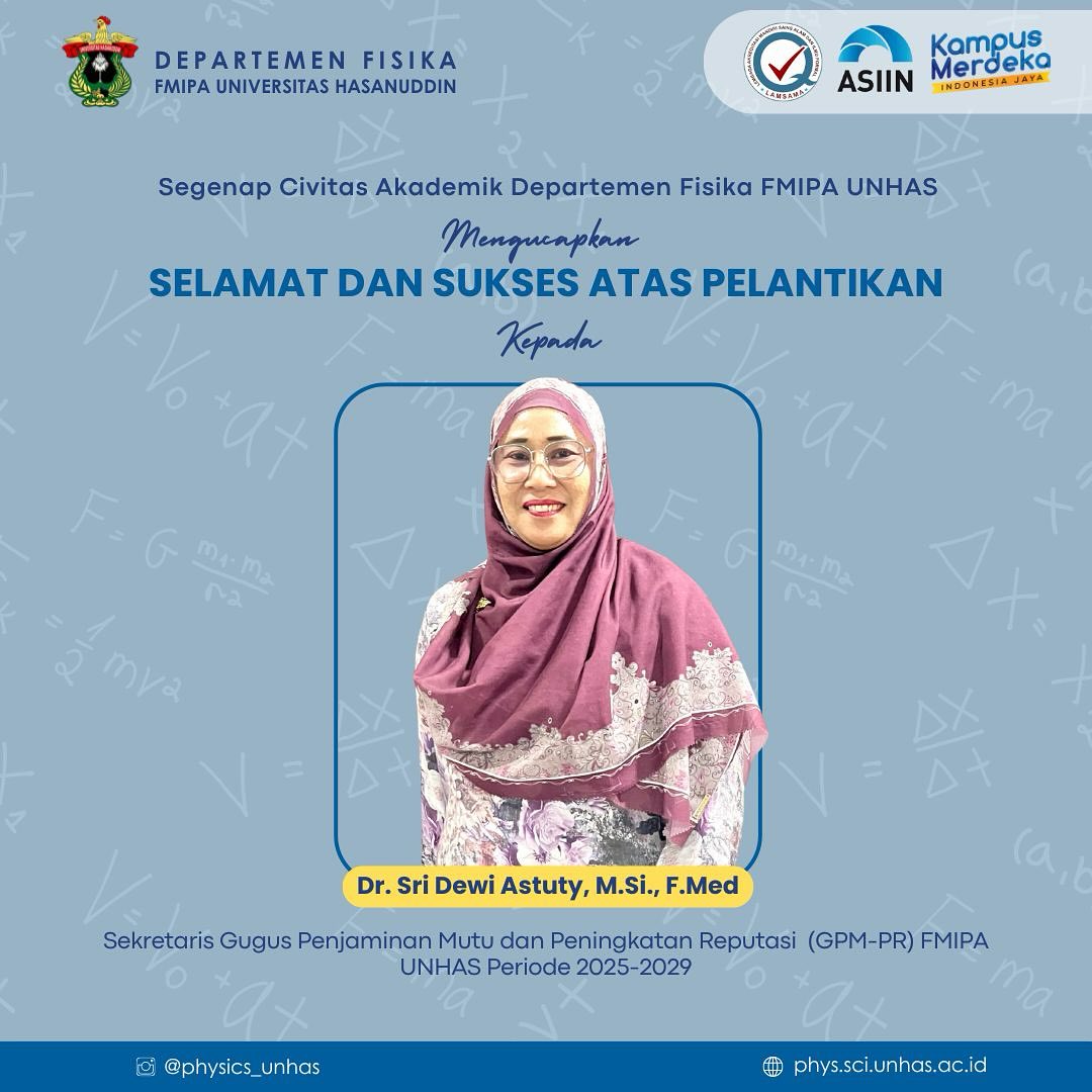 Congratulations and best wishes to Dr. Sri Dewi Astuty, M.Si., F.Med., on her inauguration as the Secretary of the Quality Assurance and Reputation Enhancement Cluster (GPM-PR) for FMIPA Unhas, for the 2025-2029 period