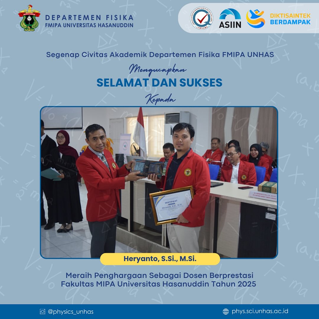 Congratulations and best wishes to Mr. Heryanto, S.Si., M.Si., for receiving the award as an Outstanding Lecturer at the Faculty of Mathematics and Natural Sciences, Hasanuddin University, on Tuesday, August 12, 2025.