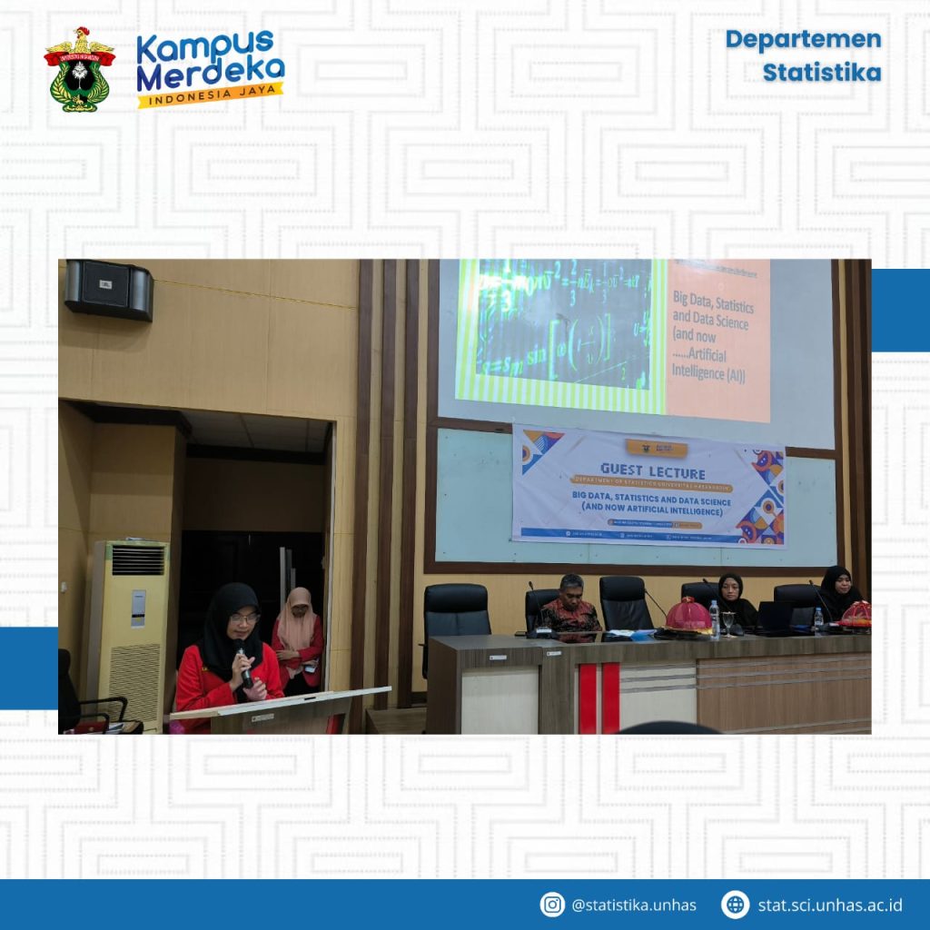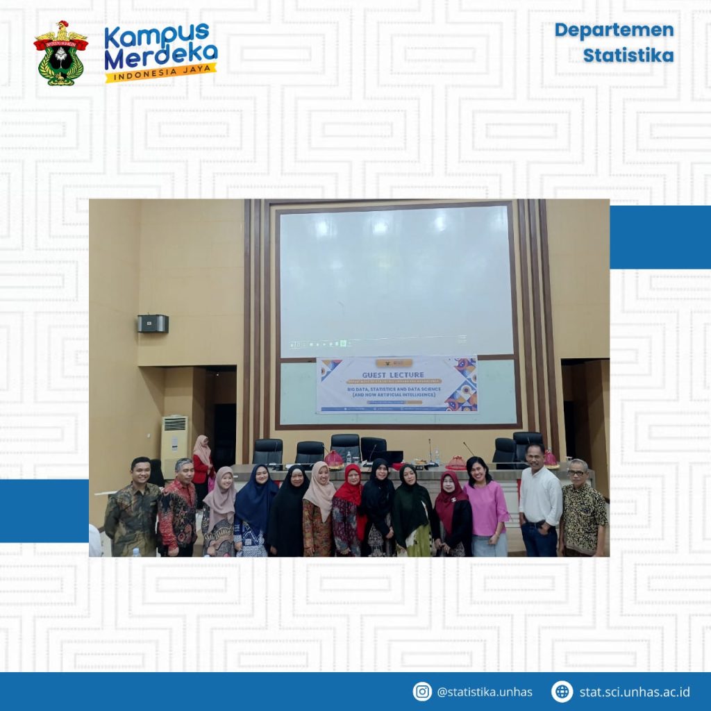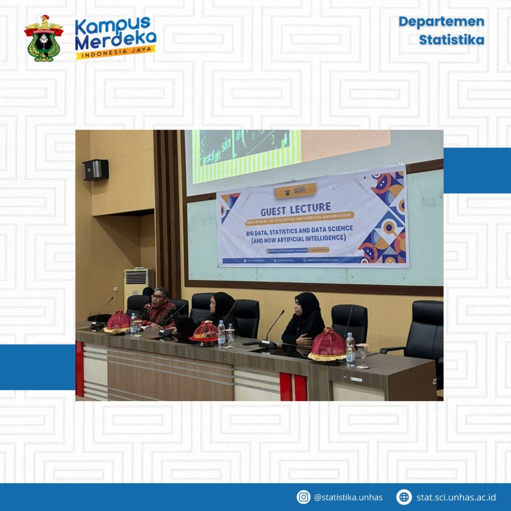 In an effort to enhance students’ understanding of the dynamic field of data science and its practical applications, an engaging guest lecture on Big Data, Statistics, and Data Science was organized at the Department of Statistics, Hasanuddin University on January 11, 2024. The event garnered significant attention from students, faculty members, and professionals.