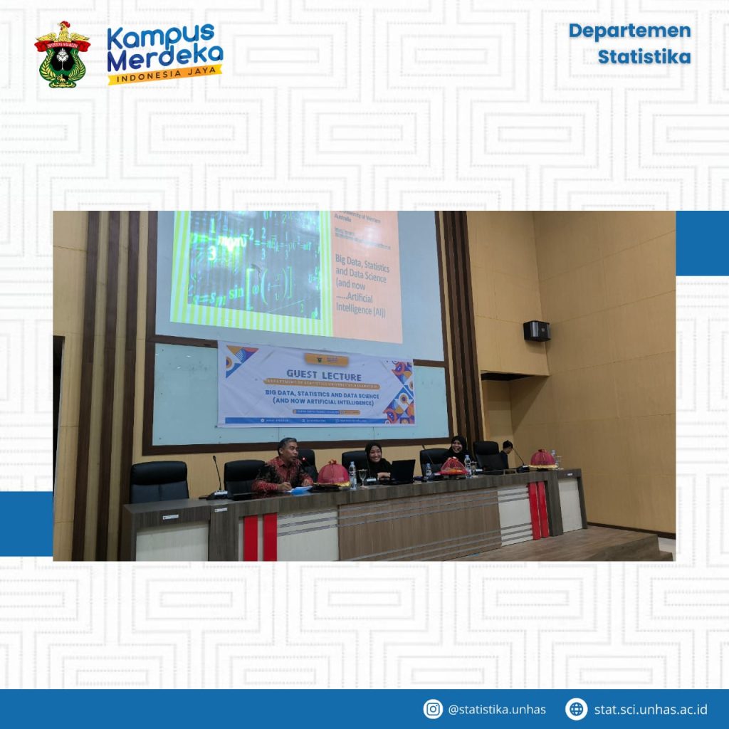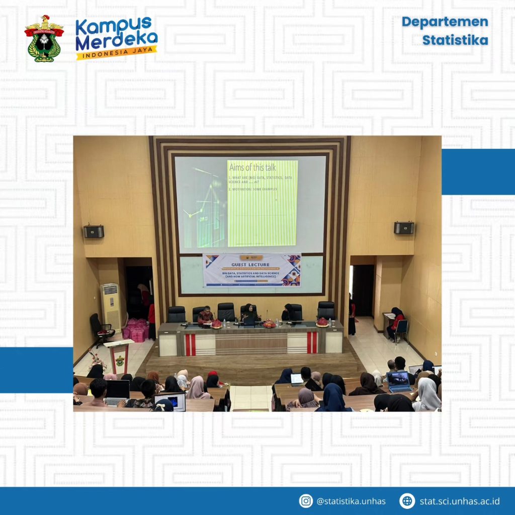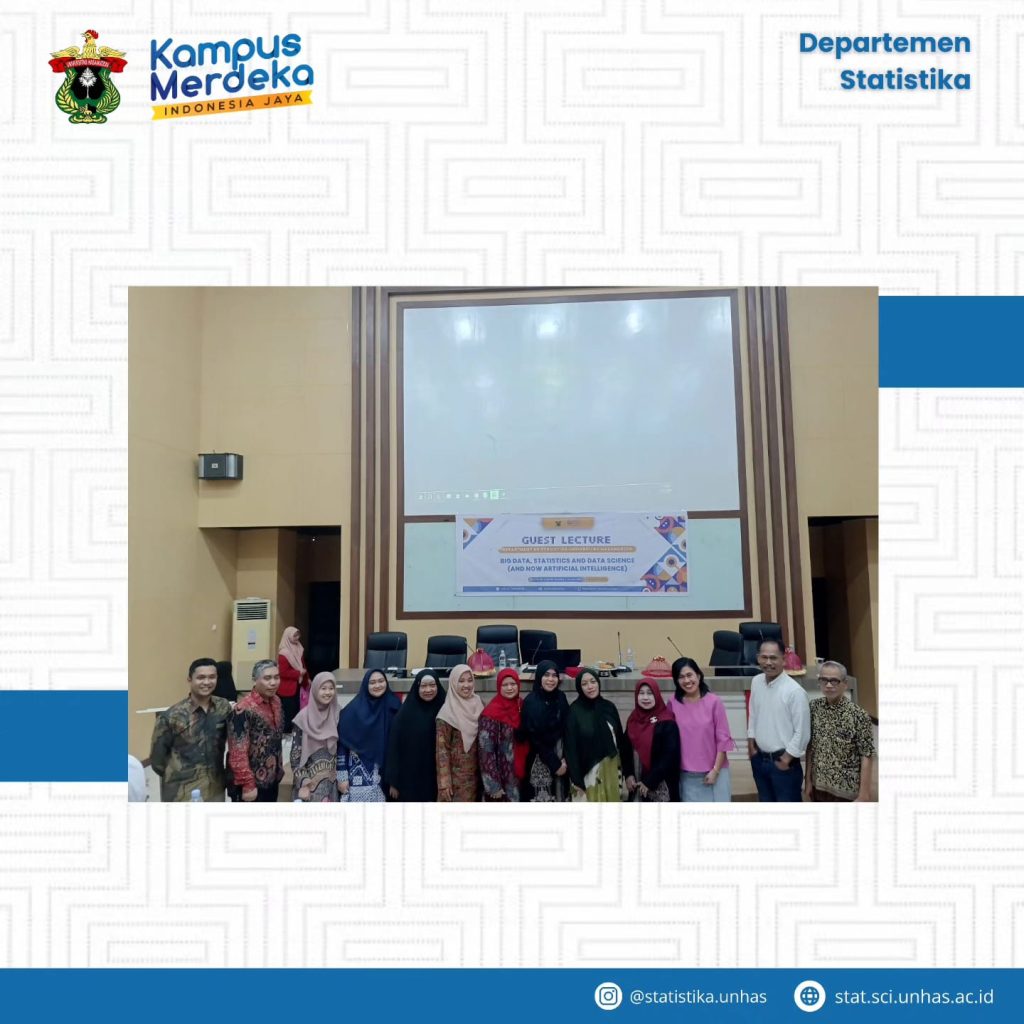 In an effort to enhance students’ understanding of the dynamic field of data science and its practical applications, an engaging guest lecture on Big Data, Statistics, and Data Science was organized at the Department of Statistics, Hasanuddin University on January 11, 2024. The event garnered significant attention from students, faculty members, and professionals.
