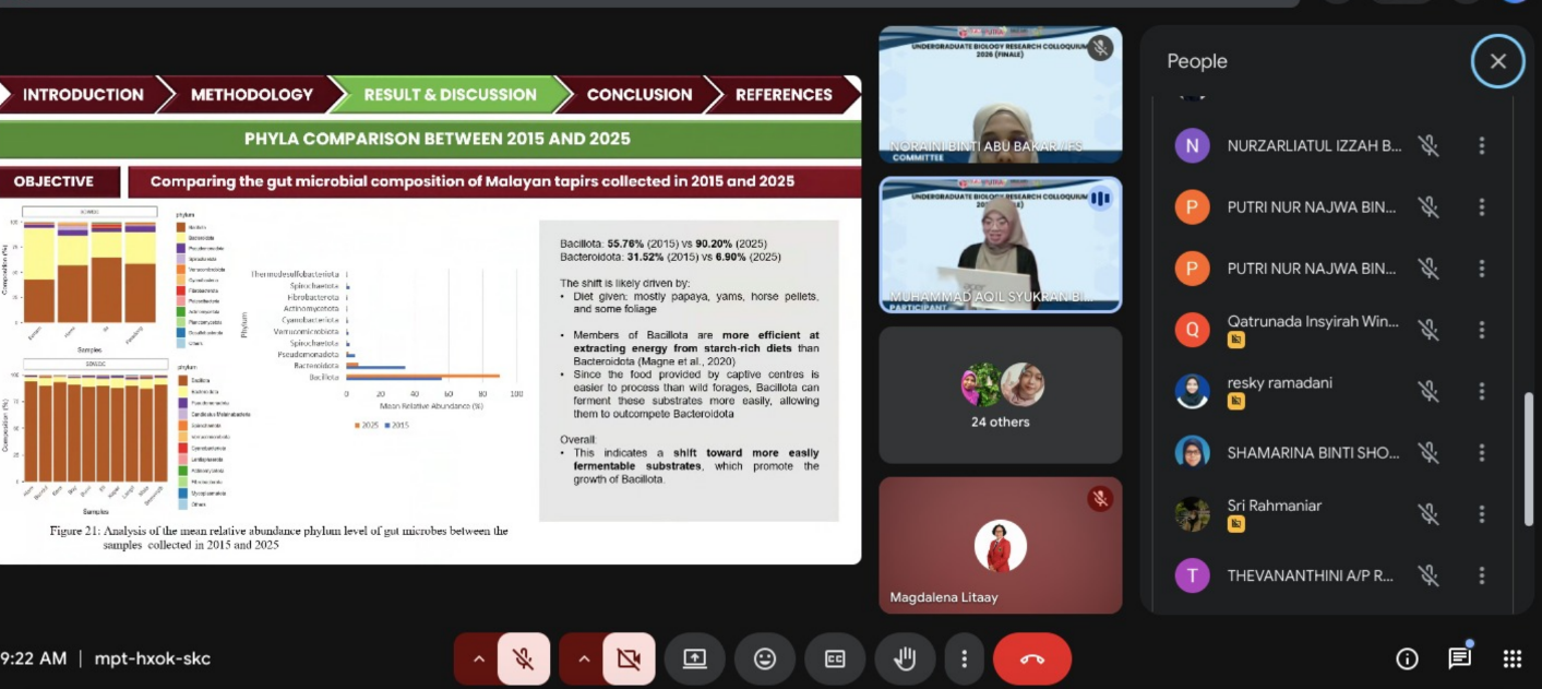 In this activity, students have the opportunity to present the results of their final research projects as part of an undergraduate scientific forum. The 2026 Undergraduate Biology Research Colloquium was officially opened by Dr. Noraini Abu Bakar, Ph.D., Senior Lecturer at the Department of Biology, Faculty of Science, Universiti Putra Malaysia. In her opening remarks, she emphasized the importance of scientific forums for undergraduate students as a means of developing research capacity, scientific communication, and strengthening international academic networks in the field of biology.