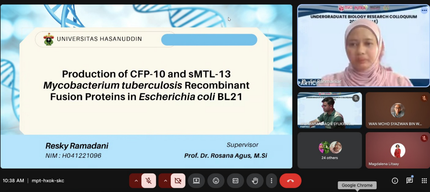 Resky Ramadani, as the first participant from the Biology Study Program at Hasanuddin University, presented his research results entitled “Production of CFP-10 and sMTL-13 Mycobacterium tuberculosis Recombinant Fusion Proteins in Escherichia coli BL21”. In his presentation, Resky explained the background for selecting the CFP-10 and sMTL-13 proteins as important candidates in the development of biomolecules based on tuberculosis diagnostics and immunology. This research is expected to contribute scientifically to the development of molecular approaches to support research on infectious diseases, particularly tuberculosis.