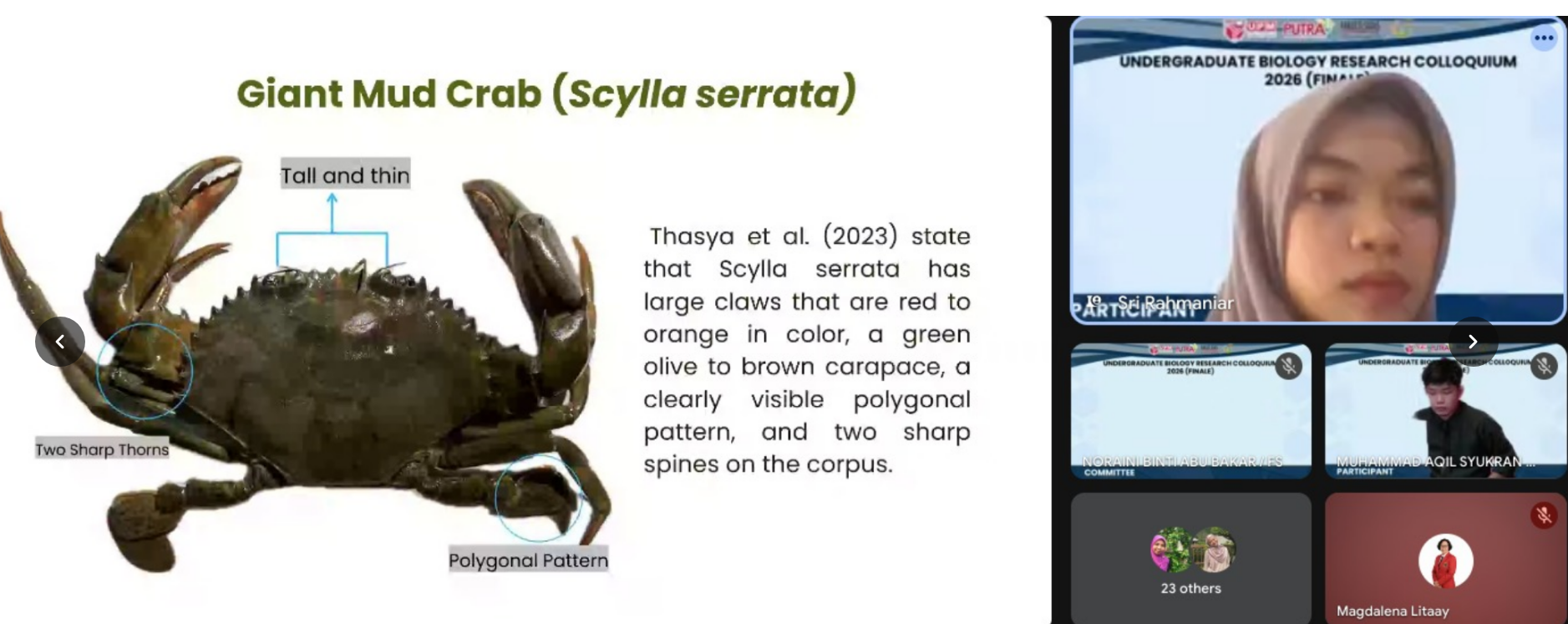 The second participant from the Biology Study Program at Hasanuddin University, A. Atiqah Nurul Amalyah Esa, presented her research results entitled “Morphometric Analysis of Mud Crabs (Scylla spp.) in the Kuri Caddi Mangrove Rehabilitation Area, Maros Regency, South Sulawesi”. In her presentation, Atiqah explained morphometric analysis as an approach to examine the variation in size and body proportions of mud crabs (Scylla spp.) living in the Kuri Caddi mangrove rehabilitation area. This study aims to assess the population status and biological response of mud crabs to mangrove ecosystem rehabilitation efforts, as well as to provide relevant scientific information for the sustainable management and conservation of coastal resources.