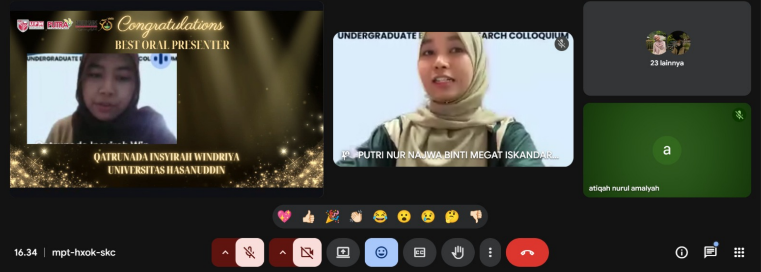 Qatrunada Insyirah Windriya won an award in the Best Oral Presenter category. This achievement is a form of recognition for the quality of scientific presentations, depth of research analysis, and academic communication skills displayed at the 2026 Undergraduate Biology Research Colloquium, as well as bringing pride to the Hasanuddin University Biology Study Program at the international level.