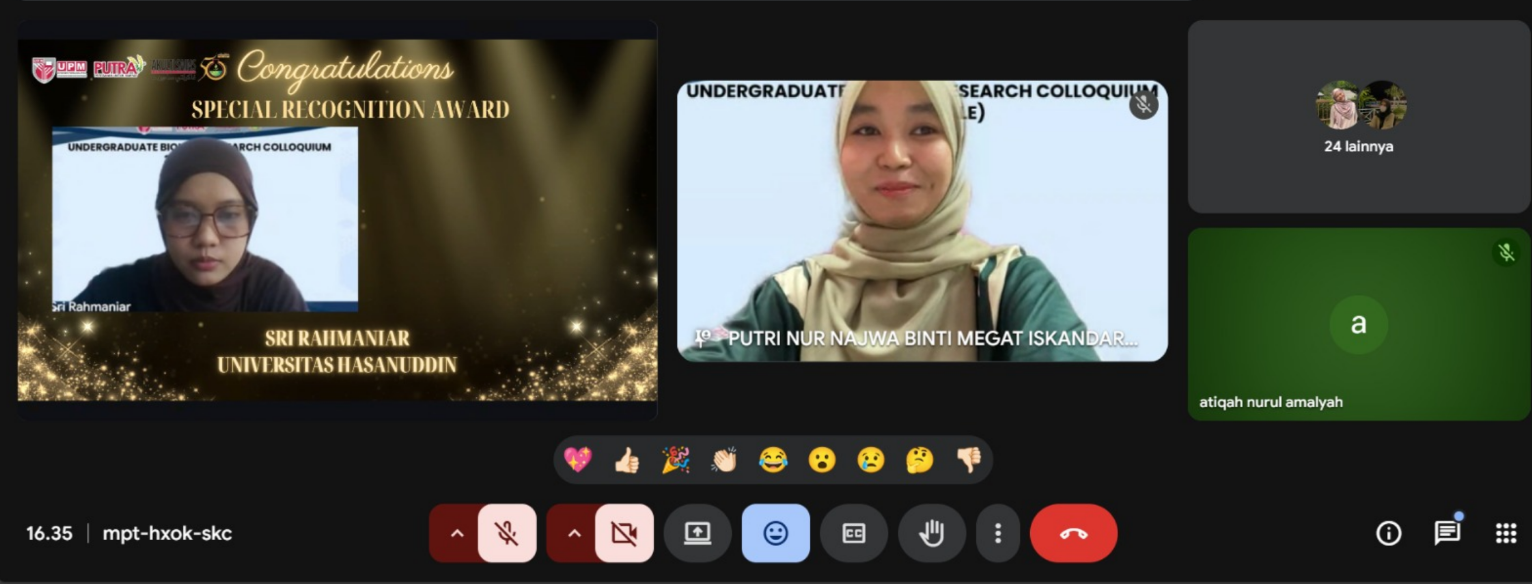 The Biology Study Program, Faculty of Mathematics and Natural Sciences, Hasanuddin University participated in the Undergraduate Biology Research Colloquium (UBRC) 2026, which was held online by Universiti Putra Malaysia on February 12, 2026. This event served as a scientific forum for biology undergraduates to present their research findings and exchange scientific ideas across institutions and countries. With the theme “Charting Biological Frontiers through Sustainable Innovation in Life Science Research,” the colloquium aimed to encourage innovative and sustainable biology research in line with the achievement of the Sustainable Development Goals (SDGs). Through participation in this event, students from the Biology Program at Hasanuddin University gain valuable international academic experience and expand their knowledge and networks in the field of life sciences.