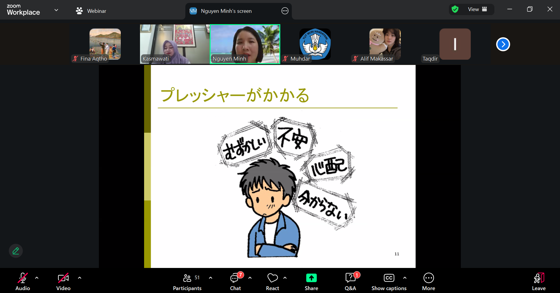 The webinar featured Nguyen Thi Minh, a lecturer from Hanoi University, Vietnam, as the speaker. In her presentation, she explained interactively about the working culture in Japan, starting from how to introduce oneself in the workplace, the discipline and neat working habits of Japanese society, to how to build professional relationships, including the etiquette of giving and receiving business cards in Japanese business culture.
